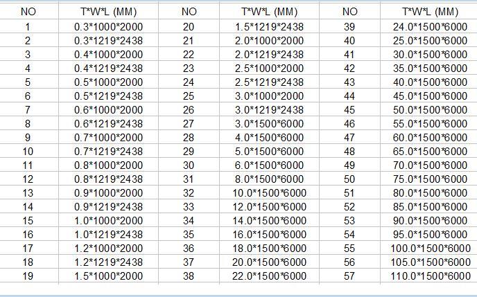 Larĝo:1000mm, 1219mm, 1500mm, 1800mm, 2000mm, 2500mm, 3000mm, 3500mm, ktp.